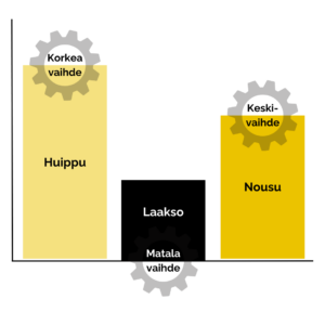 - Tyypillisesti iltapäivään sijoittuva nousujakso antaa sijaa itsenäiselle valmistavalle työlle. Tässä kohtaa, kun enää ei täyttä häkää pysty tai kannata yrittää paahtaa, on tilaa alustaa esimerkiksi suunnittelutyöllä seuraavan työpäivän huippujakson tehtävät ja tavoitteet.